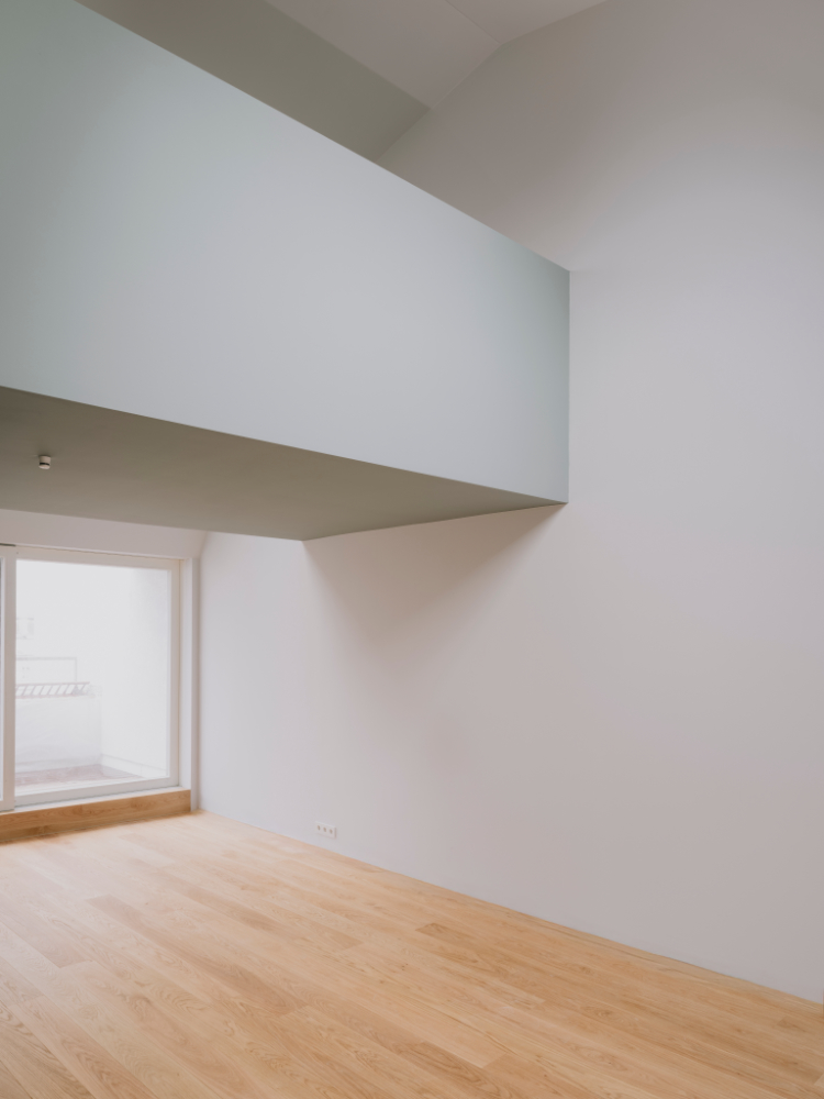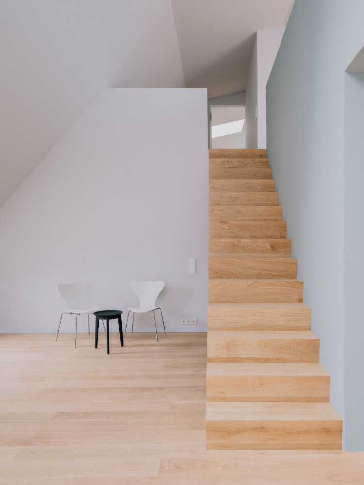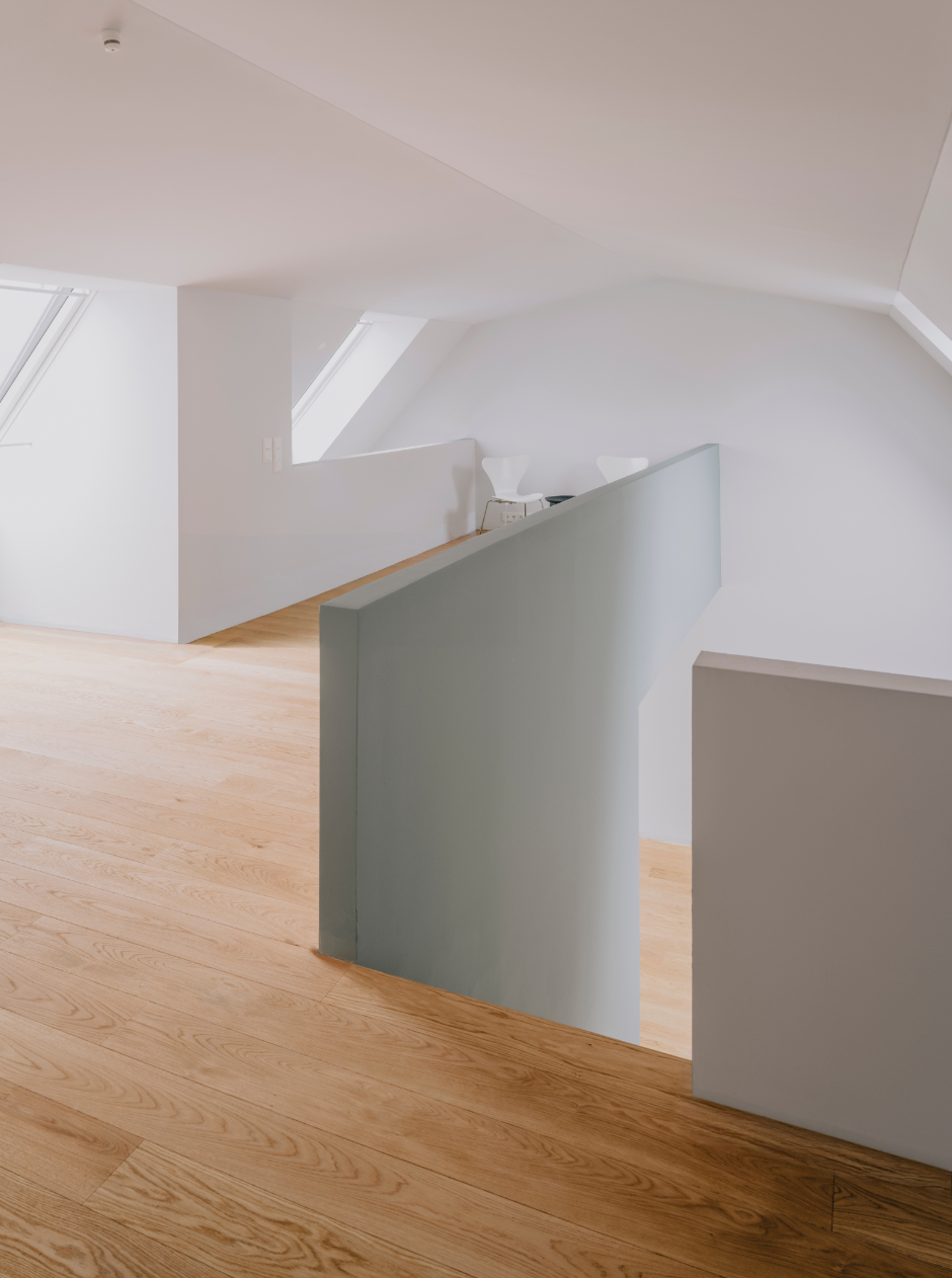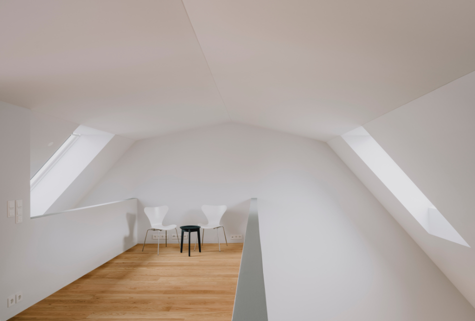 Der Neue Dachstuhl wurde im Volumen nach historischem Vorbild errichtet und die Traufe dem bauzeitlichen Erscheinungsbild folgend wieder erhöht. Dadurch erhält das Haus im Straßenraum wieder seine ursprüngliche Dimension und Proportion zurück.