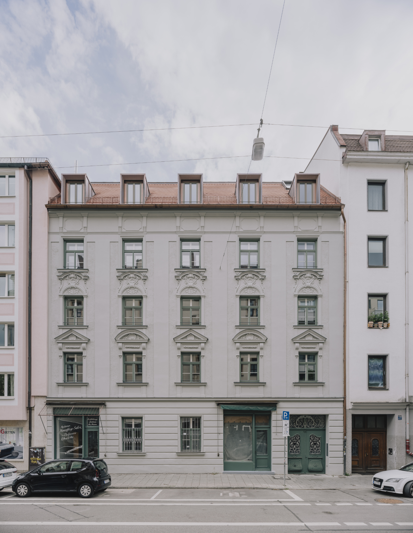 Wenige noch vorhandene bauzeitliche Kastenfenster bildeten die Vorlage für die Erneuerung der Fenster, die Fassade erhielt dadurch wieder ihre bauzeitliche Anmutung.